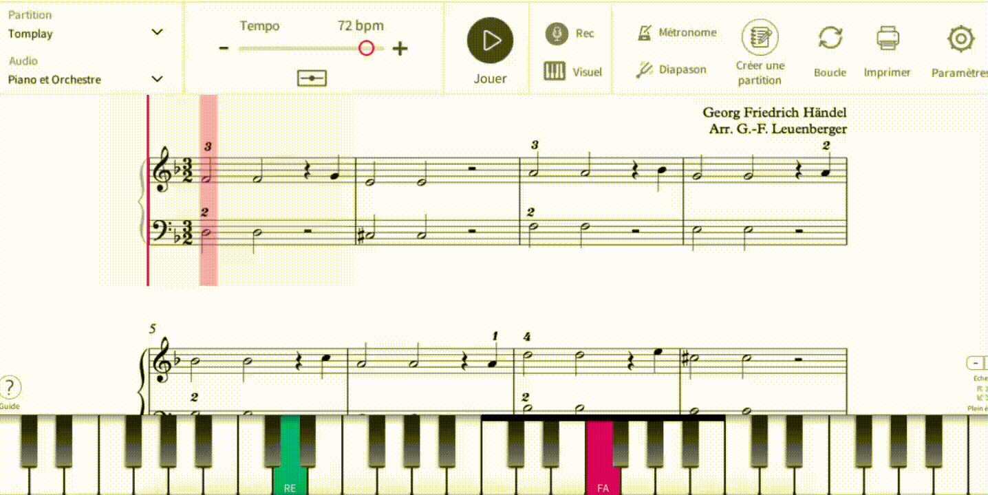 Pour les débutants ou ceux qui reprennent après plusieurs années, les aides visuelles ont un vrai intérêt. On peut afficher le nom des notes, les doigtés ou encore un instrument virtuel (par exemple un clavier pour les pianistes) qui met en avant les touches à jouer. Ce ne sont pas des béquilles, mais des repères utiles quand la lecture devient dense ou lorsqu’on aborde un passage délicat.