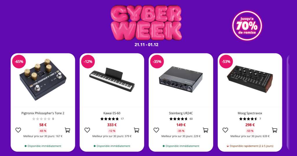 La Cyber Week s’étend sur dix jours complets, les remises touchent toutes les familles d’instruments et la disponibilité du stock est largement supérieure à celle des autres enseignes.