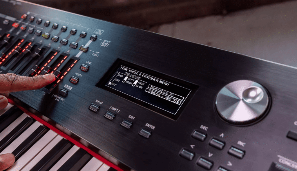 Les tirettes physiques pour les orgues, les faders de volume par section, les boutons d’accès direct aux effets sont autant d’éléments qui font la différence en situation de concert.
